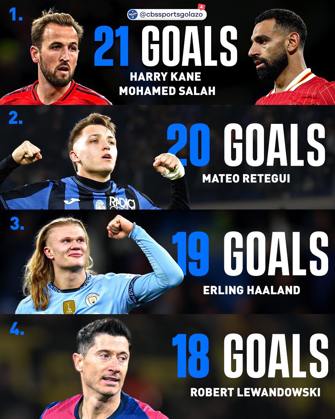 目前領(lǐng)跑歐洲金靴的是凱恩和薩拉赫,兩人都打進(jìn)了21球,雷特吉20球緊隨其后,哈蘭德19球、萊萬18球。